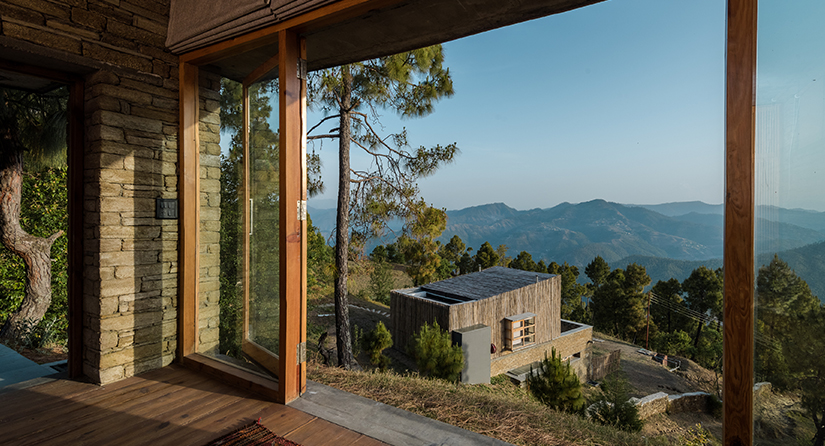 are built of locally-quarried stone mirroring Kumaoni village homes, while upper suites are built